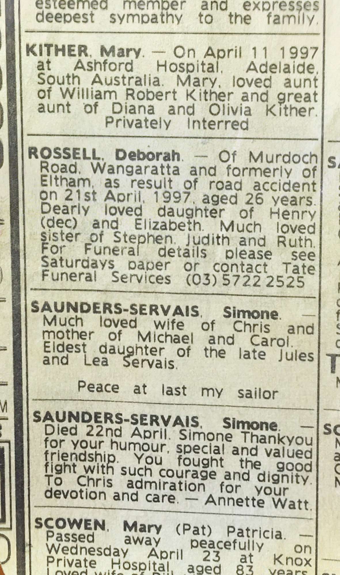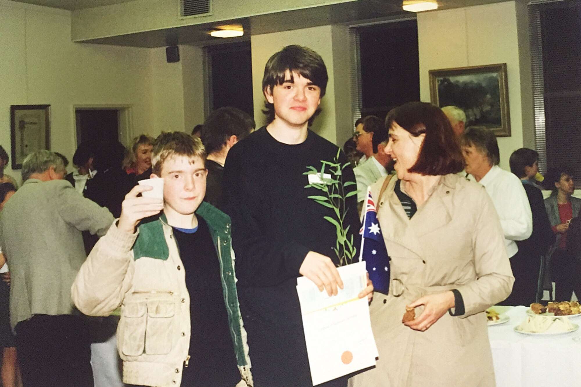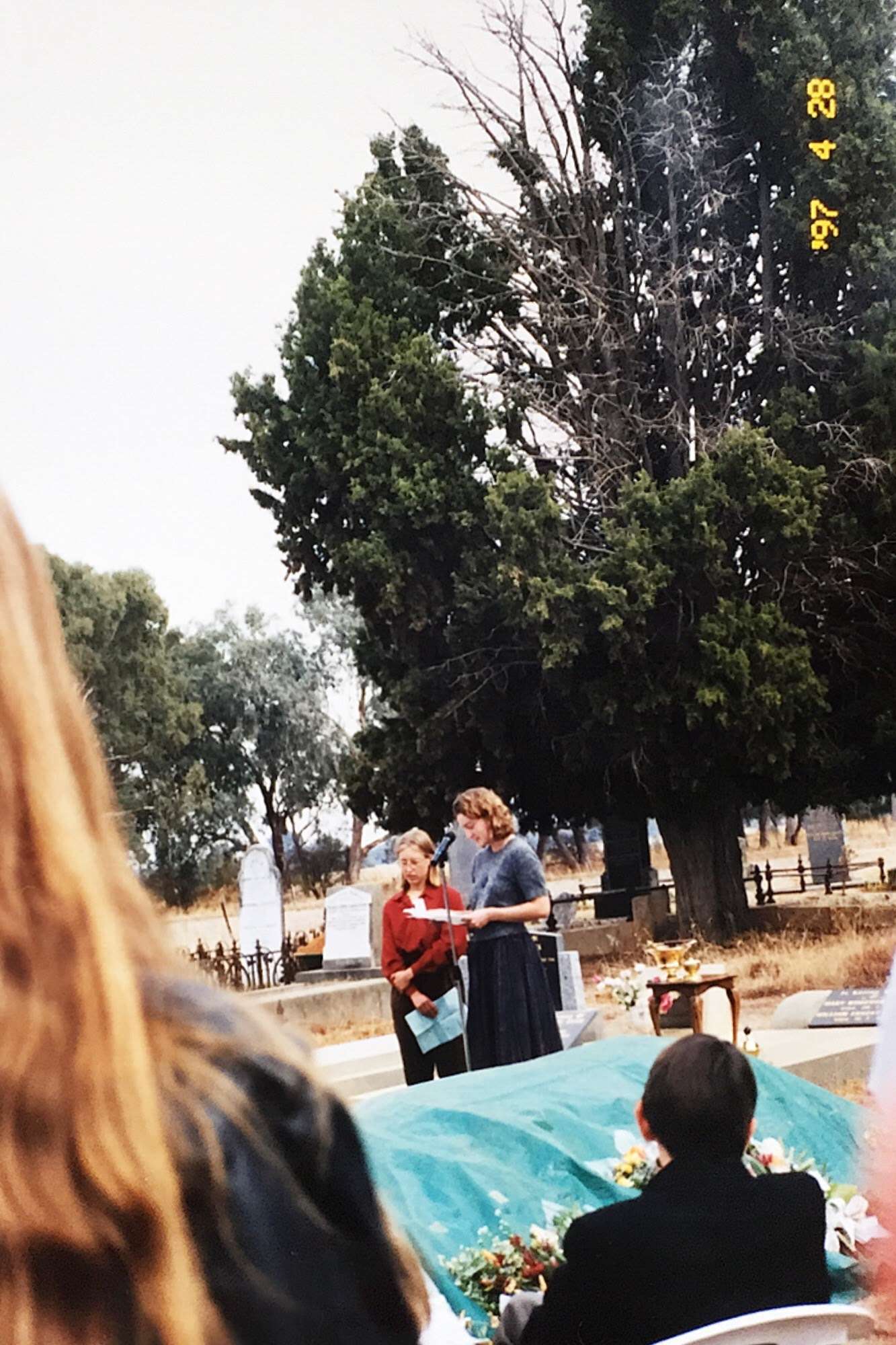 The 1990s. I went on a camping trip with Colette, Deb, and Jobber. (Deb saved Jobber from drowning, later kissed him, and broke up me.) My grandmother Doris died in 1992. (Bob and Molly died in 2000 and 2001.) I became an Australian citizen. I joined Deb on part of her epic walk to Queensland. I dated Jane. I had a party with lots of FOULies. Liz went to a family reunion. I dated Madeline. I went to Berkeley. I dated Sunny. I went to Paris, Barcelona, and hiking in the Pyrenees. Deb died. I went on a road trip and hiking with Saul. I went to Ben and Sarah's wedding. I graduated Berkeley and came back to Melbourne. Liz and John were into bellringing, and rang in the new year 2000.